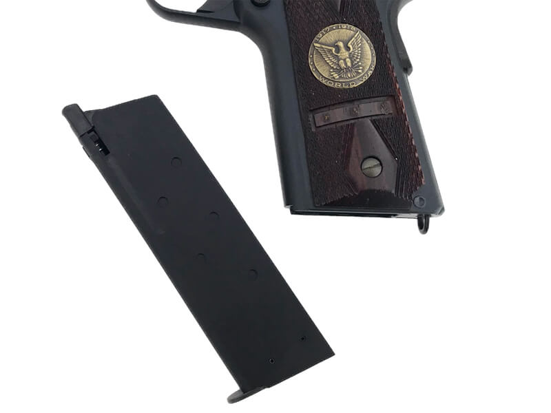 1911年、陸軍はこの新型拳銃を『M1911』の名前で採用。1926年には細かな改修を加えられた『M1911A1』に発展した。その名の通り1911年に米軍に正式採用され、第1次大戦における実戦使用で得られた教訓から各部に小改良が施されました。この改良型M1911は1920年代後半に『M1911A1』として再度制式化されました。