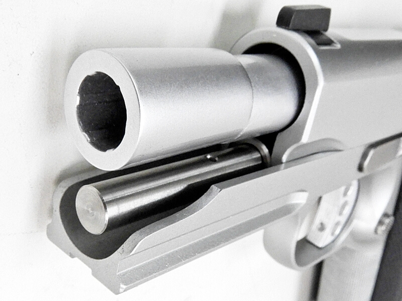 4インチフルバレルにダグラスカットされたアクセサリーレイル付き。5インチのフルサイズモデルよりも短いスライドの効果で 軽快かつ鋭いブローバックフィーリングを楽しめます。
