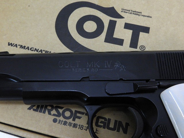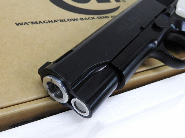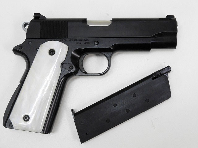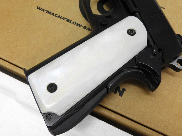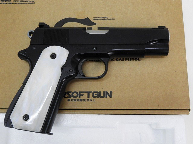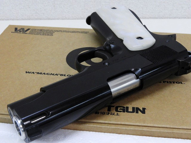ウィルソン CQBカスタムスライド、全体黒染、パールグリップ、トリガーがホールのないタイプに変更などいろいろカスタムされています。付属マガジンは現行品リップ別体マガジンの黒。
