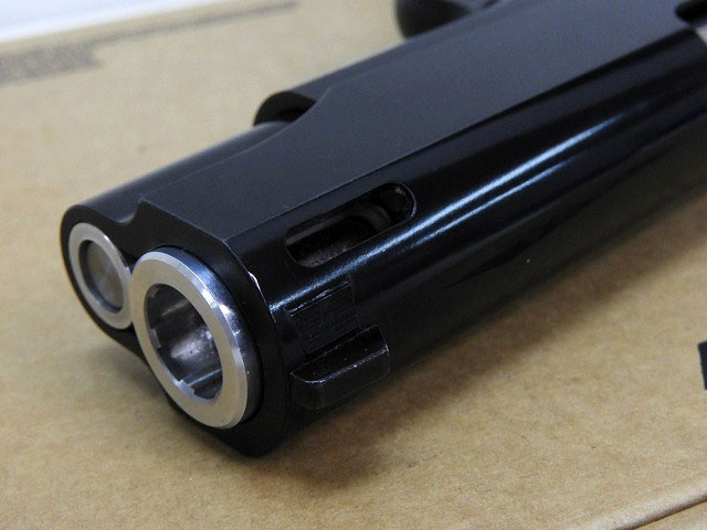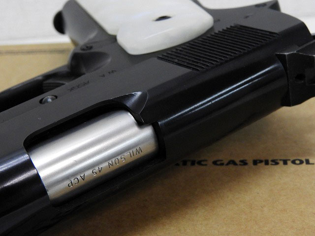 サイズはコマンダーサイズ、CQBカスタムの特徴のスライドのマズルポートやシルバーのコーンバレル、チャンバーカバーもシルバーでウィルソン.45ACP刻印入り。