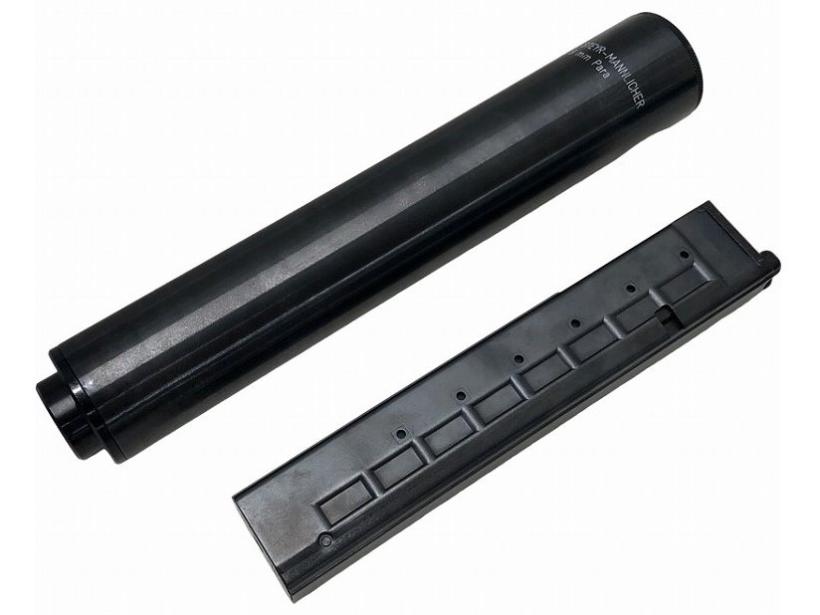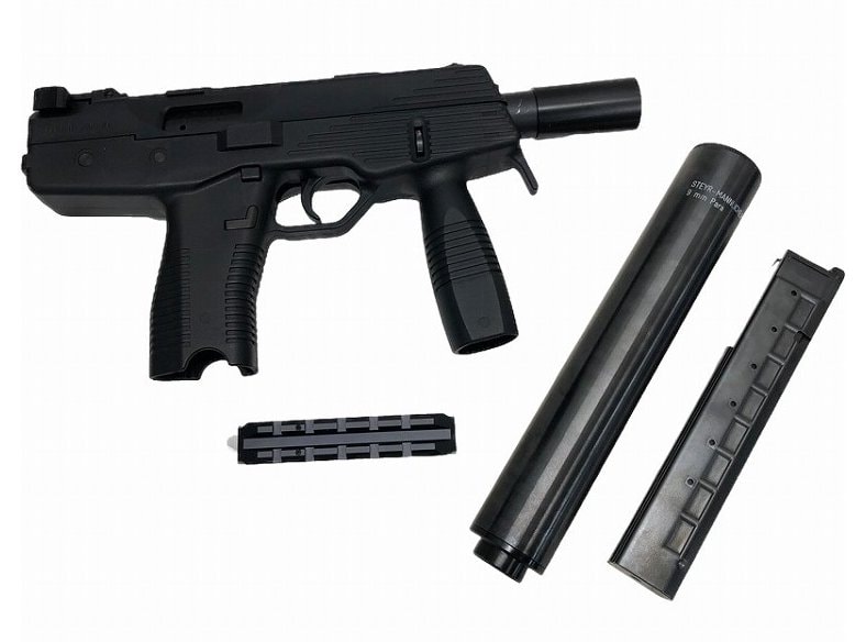 オーストリアのスタイヤー社が世界のNO.1サブマシンガン『MP5』の座をおびやかすべく、1992年に精鋭戦闘集団である特殊部隊向けに開発した 最新鋭マシンピストル。 こちらはサイレンサー マウント ロングマガジンのフルセットモデル。