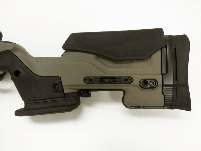 マガジンはマルイVSR-10シリーズ用と互換性があり、トリガーガード前方に装備されたボックスタイプのダミーマガジンにスペアマガジンを収納可能。ポリマー製ストックは一見無骨に見えるものの、本体重量約2.8kgと軽量に抑えられており、取り回しも上々です!
