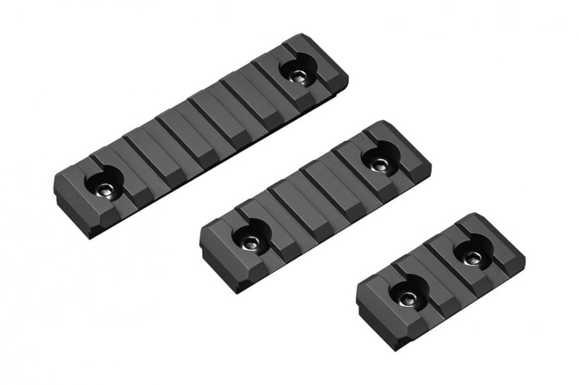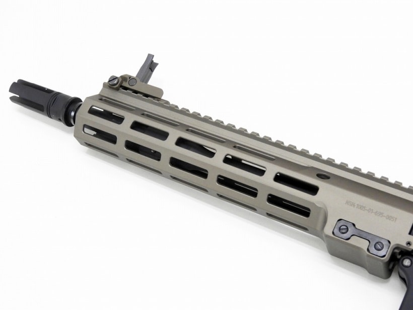 ハンドガードは、レイルシステム「M-LOK(エム-ロック)」を採用した、10.5インチ スーパーモジュラーレイル(SMR)MK16 M-LOK DDCを再現。幅20mm(ピカティニー規格)のM-LOKレイルは3スロット、5スロット、7スロットの3種類が各1枚付属。付属の六角レンチで簡単に脱着可能です。