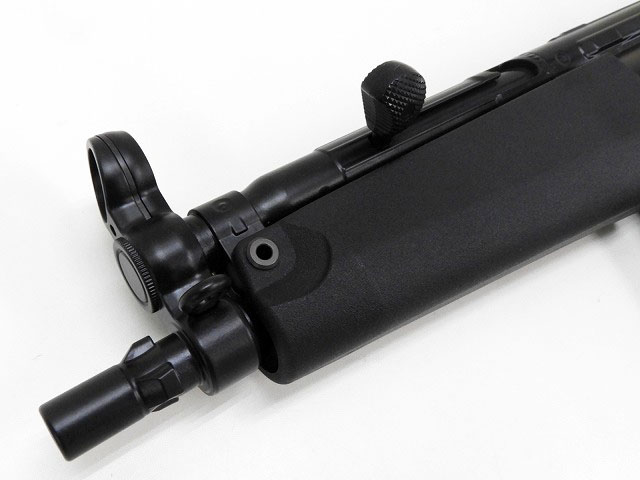 さらに「電子ヒューズ」により内部の効率化が向上、セミオートの切れがよくなり、レスポンスも向上している。これまでの次世代電動ガン同様の300gの重りが内蔵されているので、強いリコイルを楽しむことができる。リアサイトは専用の治具で調整可能、ストックも強度の高いものとなっている。バッテリーはハンドガードの中に納められている。