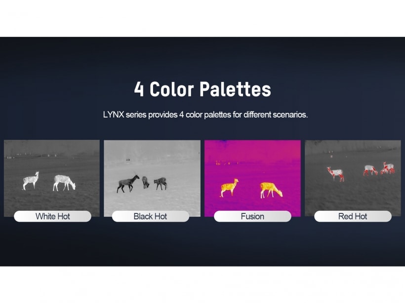[HIKMICRO] LYNX Pro LE15 サーマル暗視スコープ (新品取寄) 製品参考画像 サーマル画像の表示方法は4つのカラー・パレット(ホワイトホット・ブラックホット・フュージョン・レッドホット)から選択でき、ターゲットを識別するのに最適な表示を選ぶことが出来ます。