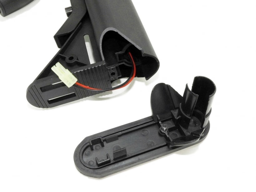 バッテリーはストック収納、セパレートタイプのリポバッテリー対応。