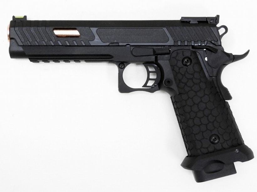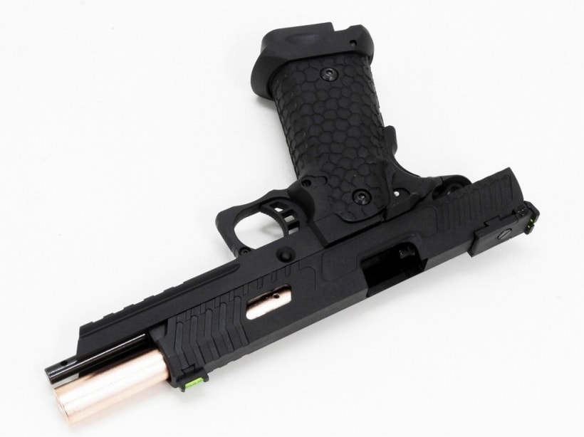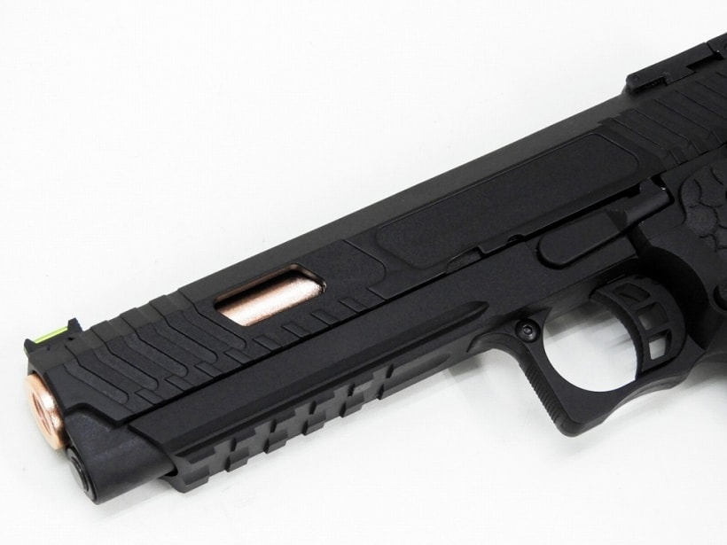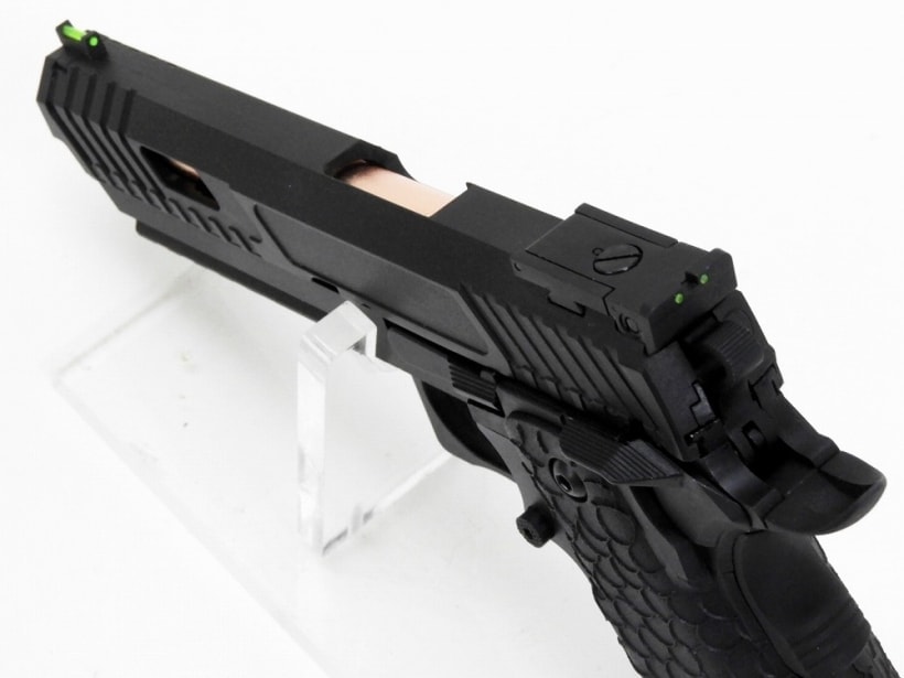 日本の法規制に適合した強化樹脂スライドは、ブロンズ仕上げのアウターバレルがのぞく両側面のポートを始め、実銃の実戦的なデザインを忠実に再現。
