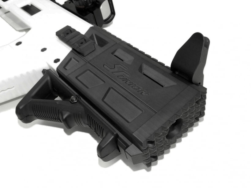 フォアグリップ内にはスペアのロングマガジンを挿入でき、電動ハンドガンで使用する場合は付属するボトムキャップを使用して拡張バッテリースペースにすることもできる。(配線は別途加工などが必要)