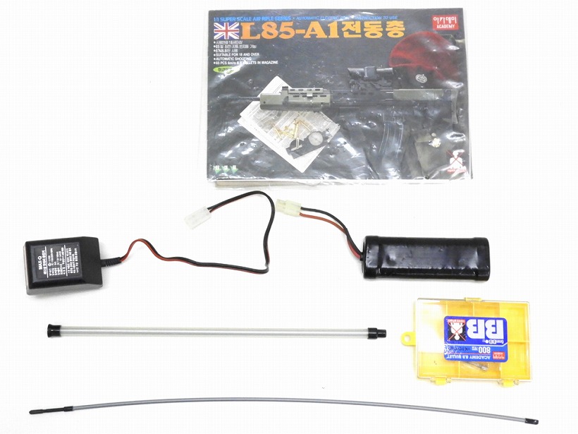 [アカデミー] L85A1 フルセット 欠品あり (訳あり) 製品詳細画像2 付属品。説明書、バッテリー、専用充電器、交換用ヒューズ、ダットサイトが付属