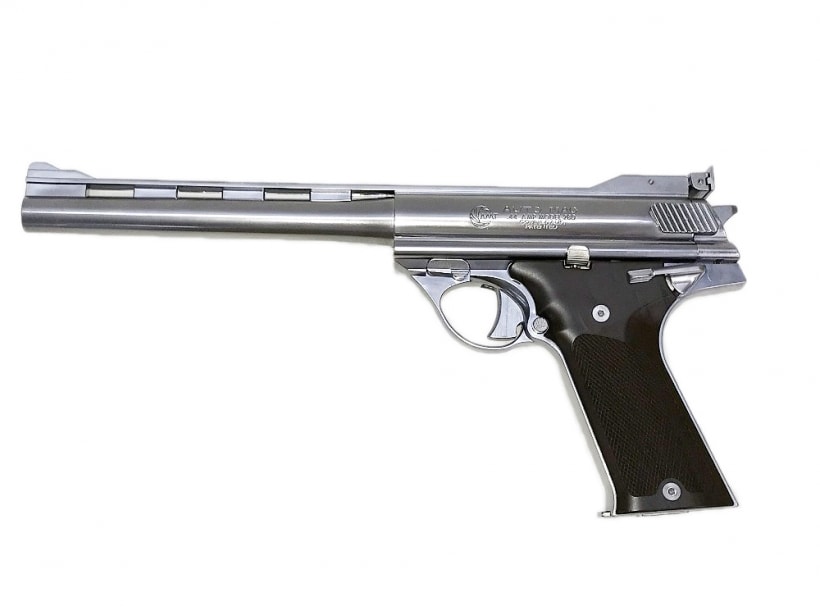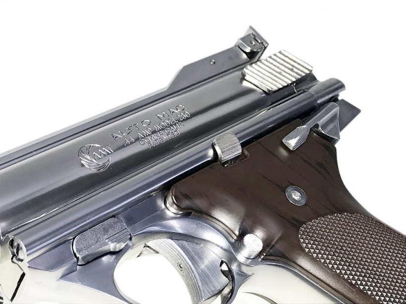 <実銃はこんな銃> 1969年に登場した世界初の、マグナム弾を使用する自動拳銃。マグナムオートという新しいジャンルの先駆け的存在。以降のオートマグシリーズと区別するため、44オートマグとも呼ばれる。 1970年、ハリー・サンフォード率いるAM社(Auto Mag Corporation)は、新技術であるステンレス材を使用することによりマグナム弾の威力に耐えうる理想の自動拳銃、オートマグを発売した。 しかし当時は未熟であったステンレス技術と、素材特有の粘りや潤滑、通常はライフル銃に使われるような複雑な閉鎖方式などのせいで、いとも簡単にジャムを引き起こし、「オートジャム」と言う不名誉なあだ名まで付けられた。 .44AMP(44 Auto Mag Pistol)というリムレスのオートマグ専用弾を使用するが、当時はどの弾薬メーカーからも発売されなかった。少し後になってようやく出たメーカーの工場製弾は質が悪かったり強力過ぎたりで、結局オーナーはライフル用の.308winのケースを切り詰めて弾を自作したが、それらが更にジャムを誘発した。 実用性という点ではサッパリだったが、その野心的な試みと、ユニークな構造に優雅なスタイル、そしてオートでマグナムという魅惑的な響きによって一躍有名となり、数多くのコアなファンを作り出した。 倒産に追いやられたAM社がトーマスオイル社に買い取られTDEとなり、一時経営が安定した頃に発表された.357口径のオートマグは貴重なコレクターアイテムとなっている(.357AMP弾は発売されず、.44AMP弾から自作するしかなかった)。