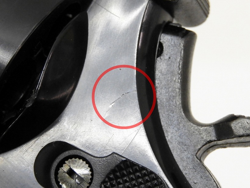 [MGC] S&W M586 コンバット・マグナム 4インチ フレーム傷あり (訳あり) 訳あり理由2 右側のフレーム(ロゴの刻印がある方)の内側のネジ穴が割れてしまっていますが、外からは見えない位置であり、動作に支障はない。