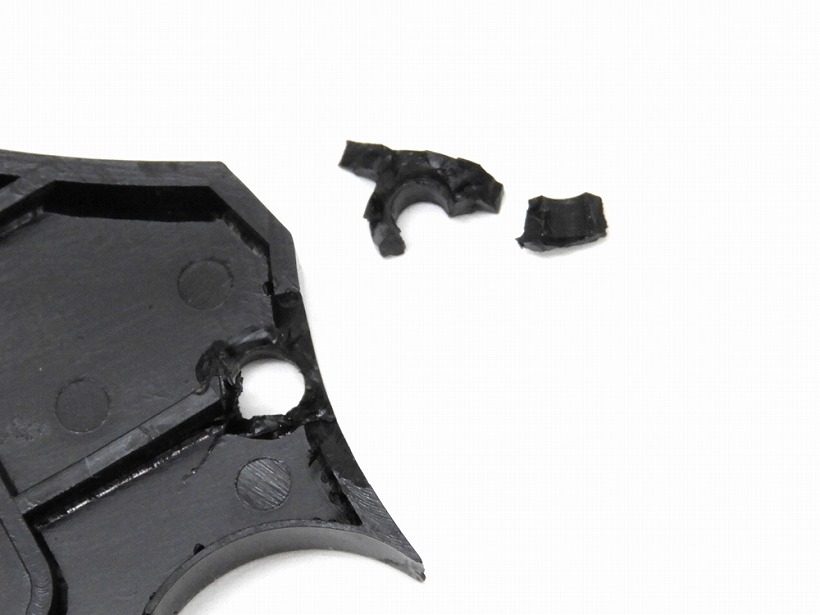 右側のフレーム(ロゴの刻印がある方)の内側のネジ穴が割れてしまっていますが、外からは見えない位置であり、動作に支障はありません。