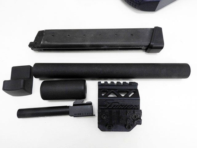 [マルイ/SRU] グロック18C PDWコンバージョンキット フルカスタム スライド戻り難あり (中古) 製品詳細画像 付属品グロックロングマガジンサプレッサー2本ノーマル樹脂バレルマウント