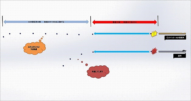 放たれたBB弾は通常の推進力が切れた後も10mほど落ちずに「飛翔」。2段階の力で飛距離を稼ぐ。