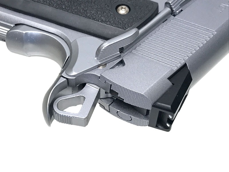 スライド先端のラウンド加工された穴からのぞくアウターバレルの10個の穴が特徴的。スプリングフィールド・アーモリー社が開発したコルトガバメントベースのコンパクトモデルでありその刻印も再現されている。