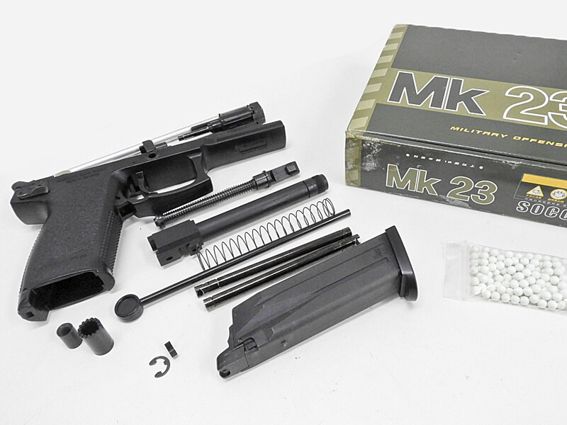 破損交換がされたこともあり、全体的に小キズの目立つ商品ではありますが、動作は良好で射って遊ぶ分には問題なく、KSCMk23ならではのヘビーなスライドを装着している事もあって、非システム7ながら重量感あるブローバックを楽しめます。