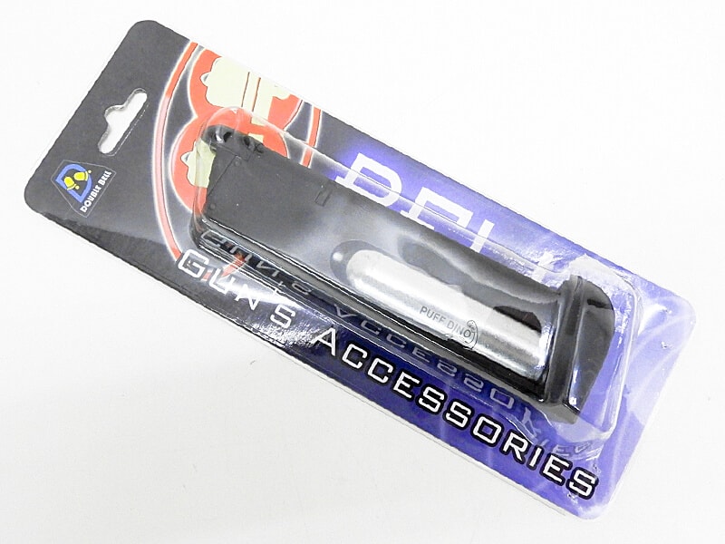 ダブルベルのM1911シリーズCO2バージョン共通のスペアマガジン。中古品は動作確認のためにPUFF DINOのガスボンベを装填しております。お使いになる前に使い切って処分してください。