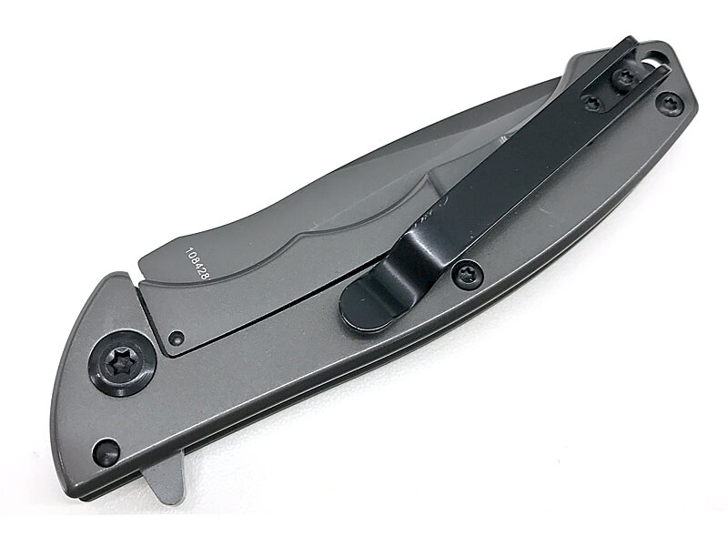 フィンガーフリッパー・フレームロック方式で、ストラップ穴のあるポケットクリップ付き。