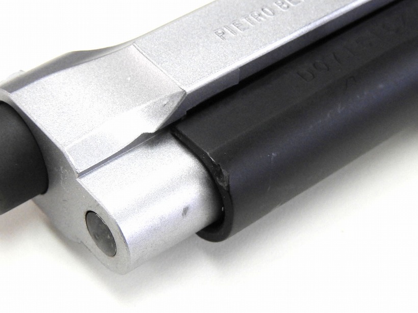 大きくバレルが露出した、べレッタ社特有のスタイル。アメリカ製のピストルとは異なり、独特のラインで構成されたイタリアならではのデザイン。