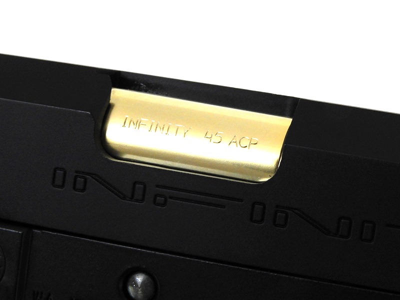 コッキングセレーションをフロントにも追加し、リアサイトをノバックとすることによって、タクティカルな雰囲気のインフィニティとなっている。スライド上面がずばっとカットされ3つの平面となっており、長いダストカバーとスライドの一体感がより増している。