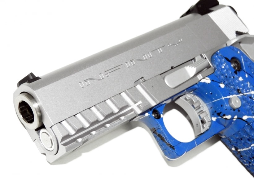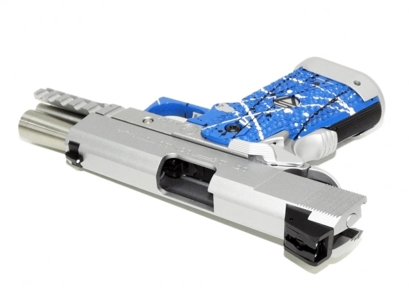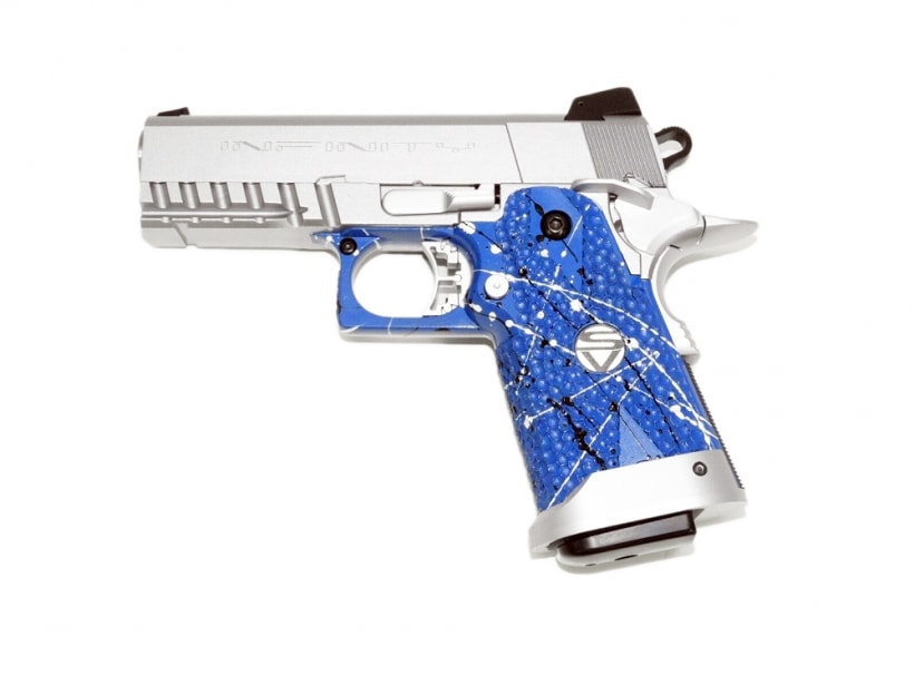 コルトガバメントのメカニズムを母体に、大型の複列弾装を装備するカスタムガン、ハイキャパシティ45オートを製造する米国のストレイヤーヴォイト社が創り出した超現代的デザインのカスタムガン。