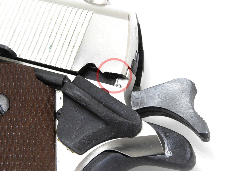[MGC] コルト ガバメント マークIV シリーズ'70 フレームシルバーモデル シルバーカスタム 欠け ヒビあり (訳あり) 製品詳細画像8 こちらに欠け。動作に問題はない。