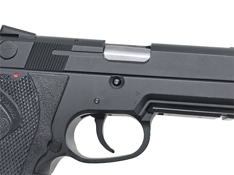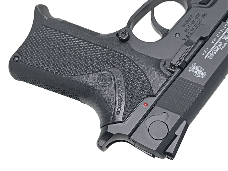 実銃世界においても、スミス&ウェッソン4桁型番シリーズの総決算的位置にあり、熟成の極みに達した人気のローエンフォースメント仕様モデル。S&W社との正式契約に基づくリアルな刻印。ブラックモデルのみデコッキングセーフティ仕様となっている。デコッキングセーフティを右側から左側に押し込むと安全装置が作動する。