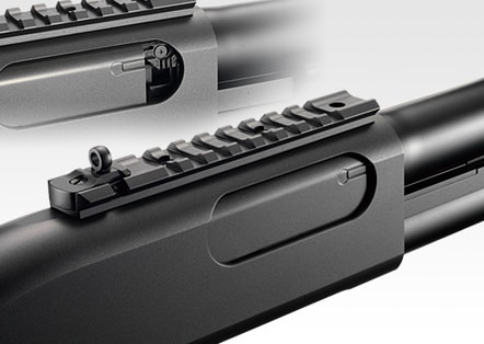 XSタイプサイト&マウントレイル装備:スコープやドットサイトなどの光学機器を取り付け可能な幅20mmのマウントレイルに、XSタイプのリアサイトを搭載。コンバットショットガンとしての実用性を備えたモデルです。