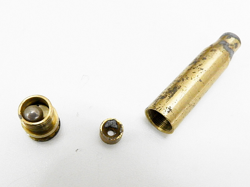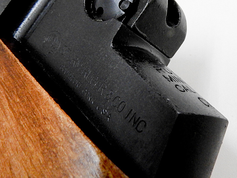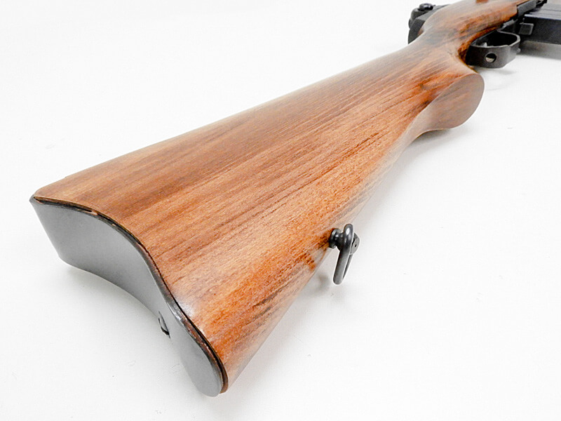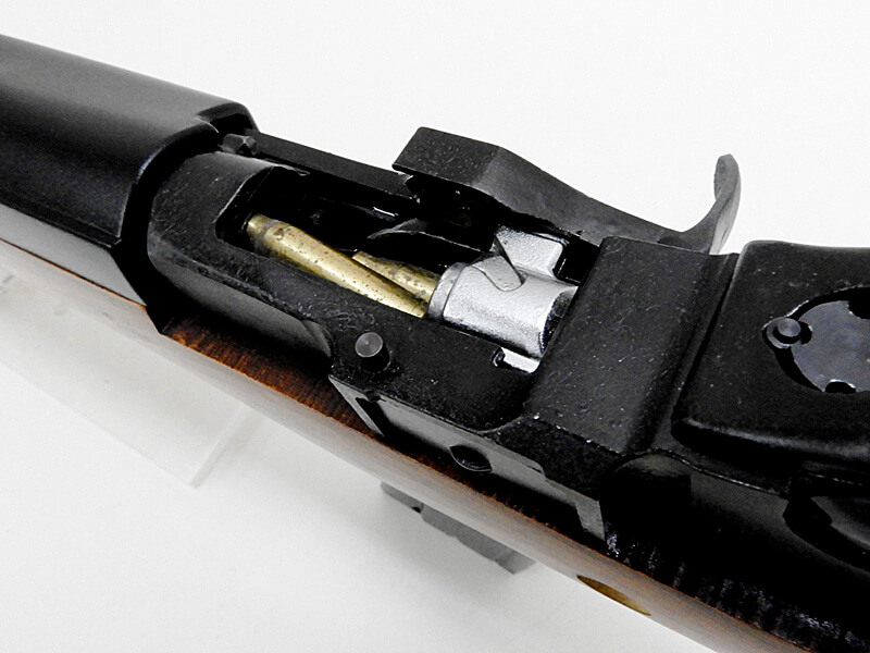 本体は比較的きれいに整備されていますが、カートリッジの状態から発火済みと思われます。発火可能かは保証外となります。木製ウレタン仕上げ&亜鉛ダイカスト製ガンブルー仕上げ(ハンドガード上部のみ樹脂製)。現状、動作に問題ありませんが、製品自体の仕様として、エキストラクターがカートリッジをつかむ力が強く、スムーズな排莢にはユーザーによる調整が必須な品となっています。また、マガジンの出し入れには少々コツが必要です。