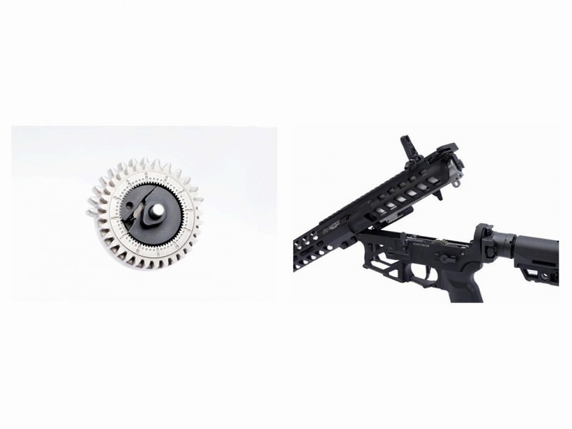 完全新規設計のメカボックス・レシーバー構造を採用したことで、既存の電動ガンと同じ外装サイズ・一体成型チャンバーを採用しながらも、ピストンストロークを短縮することでメカボックスのコンパクト化を実現、まるで実銃のようなリアルテイクダウンを可能にしました。