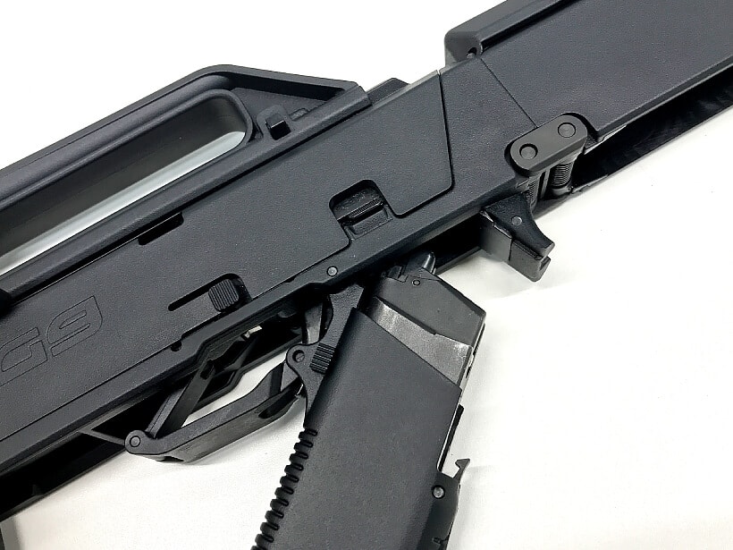 収納もハンドガードを折りたたんで押さえながらグリップ後方のスイッチを押してグリップを折りたたむ→ストックのロックを外して折りたたむ、と簡単です。