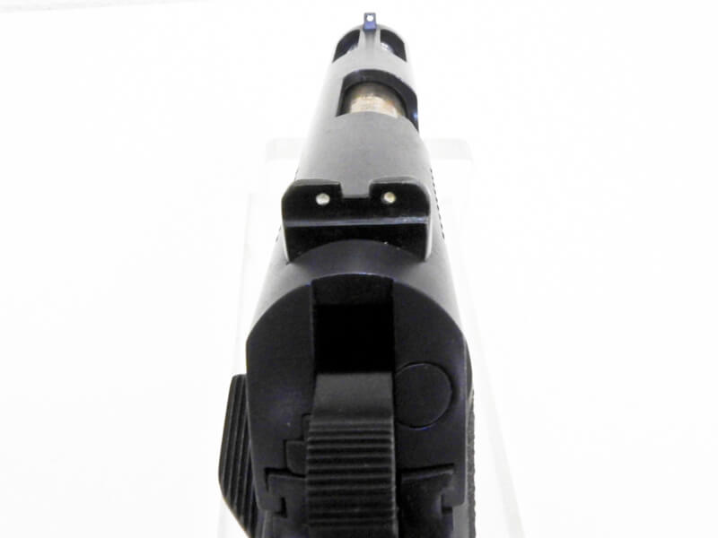HWのスライドとフレームはブルーイング加工により青みがかった鈍い輝きを放っており、黒染めされたアイアンサイト・スライドストップなどの金属パーツは使い込んだようなウェザリングが施されています。ラバーグリップのべとつき、実射時の不良動作等は特にありませんがベースが古い商品なので、ご自分である程度の調整できる方にお奨めです。