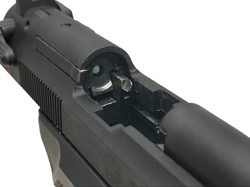 スライド上部を切り取って大きく露出させたバレル、アルミニウム合金製の軽量なレシーバー、独立ロッキング・ラグ式の閉鎖方式、デコッキング機能を兼ね備えたセーフティなどが特徴的。