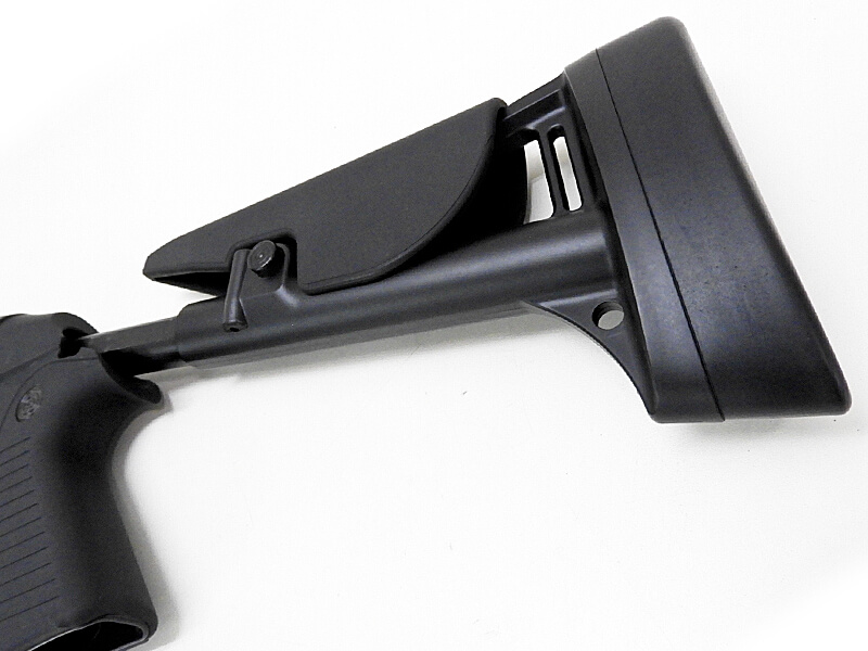 写真ではわかりにくいが実際に持ってみるとかなりしっかりしていて不安感はあまりない。コッキングは重いがストックをちゃんと使っているなら致命的と言う感じでもない。ピストルグリップ型なのもあってスペースがなくシェル帯などを利用するときは工夫が必要。自分はストックに百均のバンドで巻いている。アイアンサイトは使いにくい位置にある。