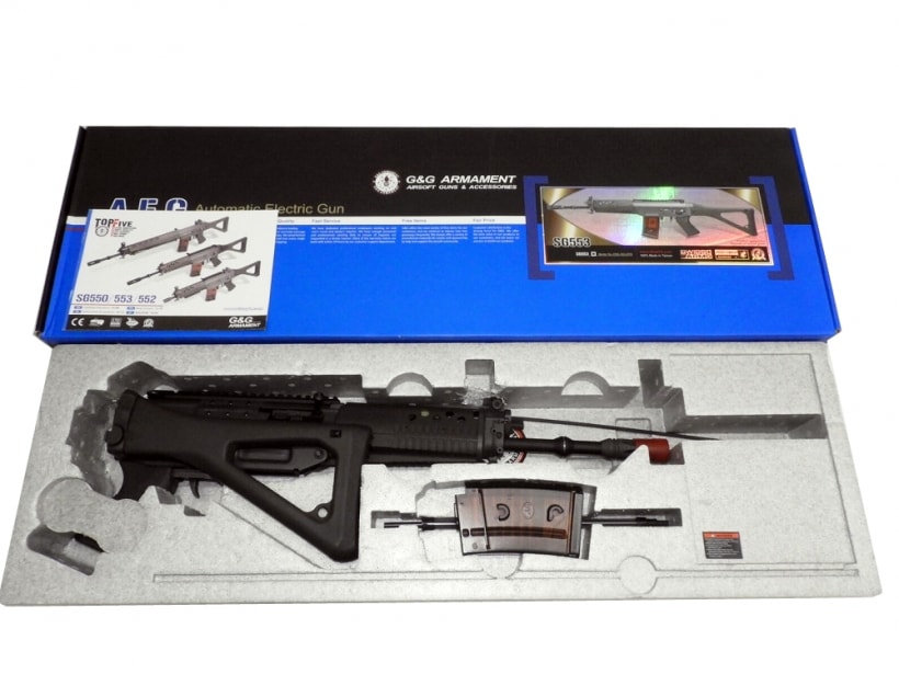 G&G製SG553。海外メーカー製だけあってメタルパーツをふんだんに使っており質感や剛性が高い。マウントレイル標準装備。