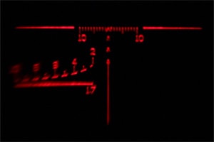 [UFC] SVD ドラグノフ スコープ 4×24 ロング 3倍~ ドーブテール ビルドインマウント イルミネーション (中古) 製品参考画像5 イルミネートカラー:レッド左下が身長170cmに準拠した簡易距離計。画像真ん中のメモリは1000m先の1mを示す目盛りとなっている。単位はミル。左右10ミルまで計測可能。