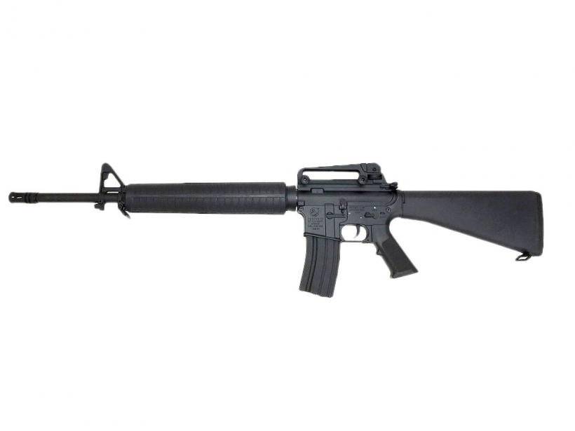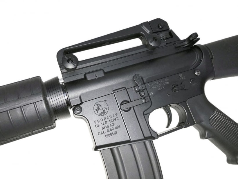 ピカティニーレイルを持つフラットトップ・レシーバーにキャリングハンドル、円錐型のプラスチックハンドガードを装備したM16A3を再現した電動ガン。