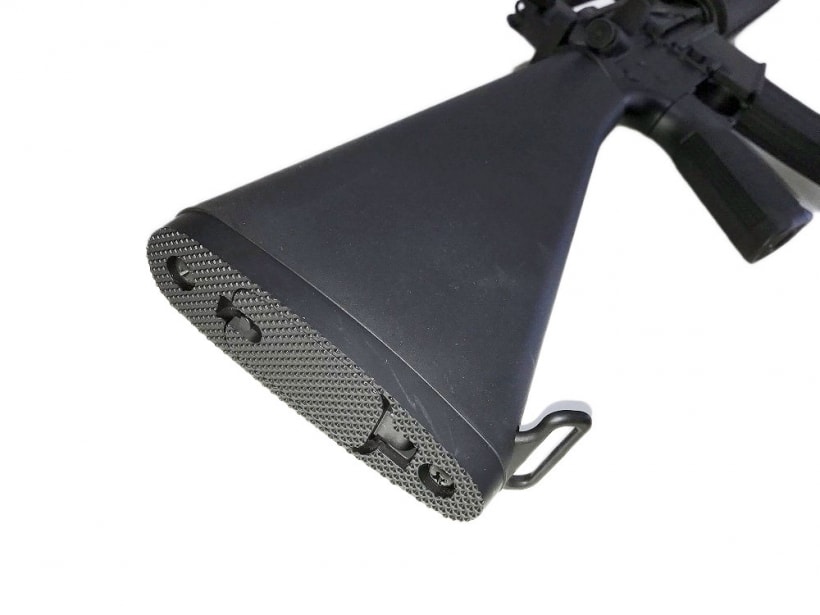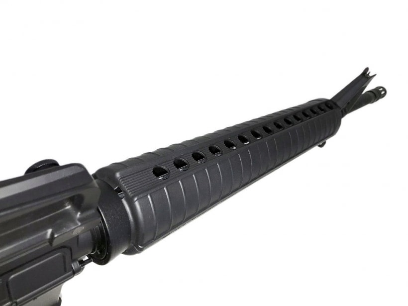 フロントハンドガードを三角断面の左右分割形状から、円断面の上下分割形状に変更。上下対称形のため、ハンドガードに左右で別形状の部品を必要としたM16(A1)よりも部品の種類がひとつ減ることになる。材質もナイロン系の高強度プラスチックに変更された。