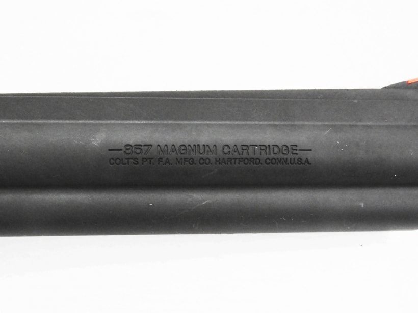 トリガーメカやグリップが改良されたマークVリボルバーに、スタビライザー効果抜群のフルバレルシュラウドを装備する357マグナムの完成型がこのモデル。80年代のメーカー純正品としては珍しいダークテイストの刻印が強烈なキャラクターを主張している。4インチモデル。
