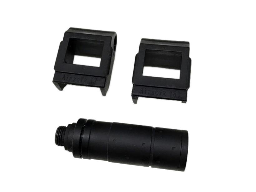 付属品。他社製のグロック17/18に対応するチャージングハンドル取り付け部品や、インナーバレルを隠すための71mmピストルサイレンサーなど付属。