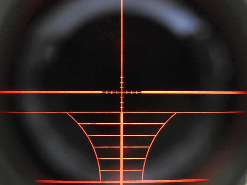 [NB] 3-9倍率 40mmレンズ径 イルミネートライフルスコープ ロング 3倍~ ピカティニー Φ30mm イルミネーション 視度調節機能搭載 ハイプロファイルマウント付き (中古) 製品詳細画像9 レティクル赤色発光時。