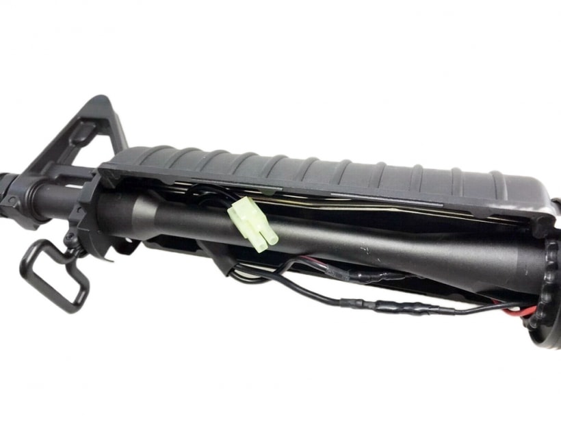 バッテリーはハンドガード内。ミニバッテリー等のサイズが使用可能となっている。