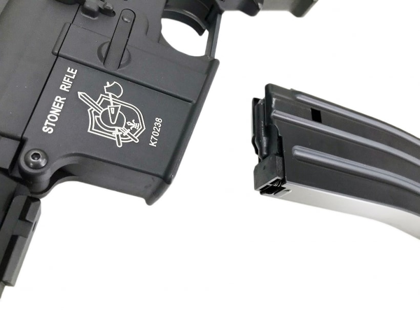 実銃同様にチャージングハンドルで初弾装填。最終弾の発射後ボルトストップが作動しボルトをロック。