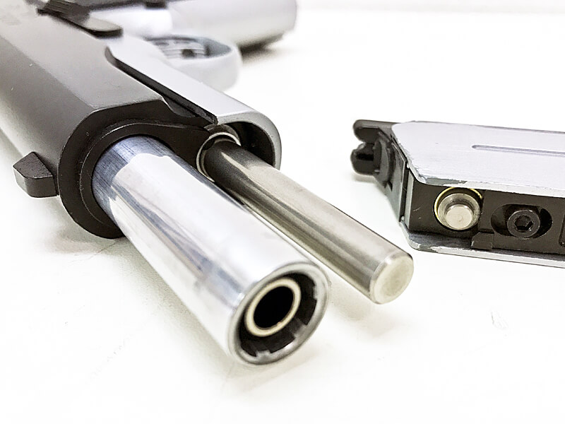 ハンドガンの場合は全体を金属性とする組み換え、エアソフトガンの場合は射出エネルギー0.98J以上にする改造を行うと銃刀法違反となります。HFC134a仕様のガスガンにCO2用マガジンを組み込む、スライドを金属製の物に差し替える等、簡易な改造でも罪に問われる可能性がございますので、絶対にお止めください。