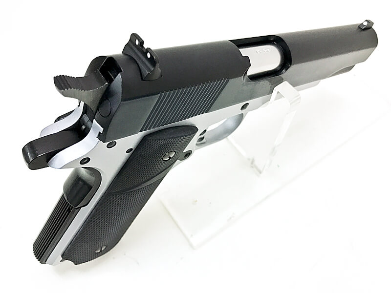 【Springfield FBI SP Bureau】スプリングフィールド・アーモリー社が製造するM1911カスタムモデル。BIがSWAT用に1996年に正式採用したもので、主な特徴はフレームのグリップ前面のチェッカリング加工、アンビセーフティとマグウェル一体型のメインスプリングハウジング、トリチウム入りノバックサイトである。この同型を米海兵隊がカスタムベースに使用するなど品質は高く評価されている。民間向けに市販もされているが2,500ドルと破格の値段である。