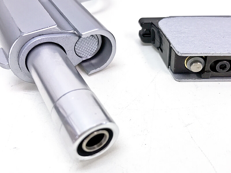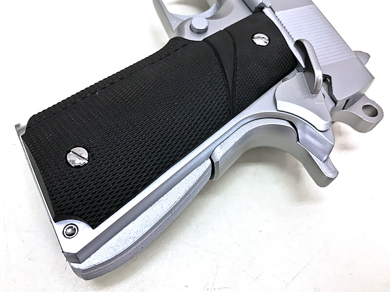 廉価版といえ、発射機構はマグナブローバックそのものでマガジンなども共用です。スライド・フレームはABS製ですが、内部におもりが入っており重量感も中々。シルバーの塗膜にやや傷があるものの動作は快調です。