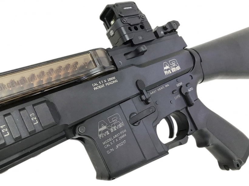 本来は5.56mm弾仕様であるAR-15ライフルを5.7×28mm弾仕様にする為に、 FN P90マガジンを搭載した前代未聞の銃が新登場!