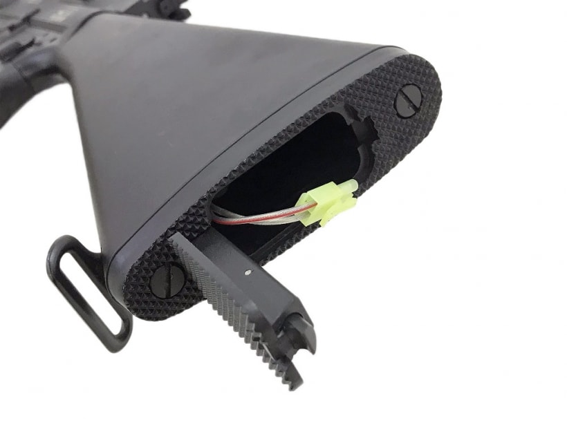 これによりバッテリースペースはかなり広く、リポバッテリーだけでなくマルイ系ニッケル水素バッテリー等サイズの大きい物も採用可能となっている。