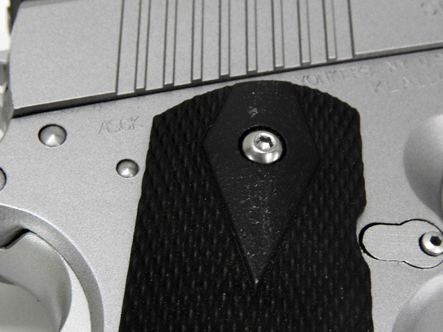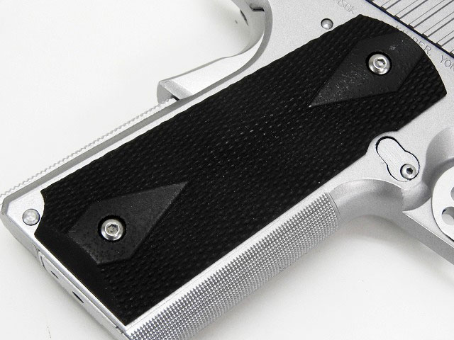 スライドには大きくセレーションが入っており、滑りにくい。5mm軸タイプの片側セフティやリアルサイズトリガー、ラバーコーティング・ダイキャストグリップが特徴的。