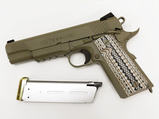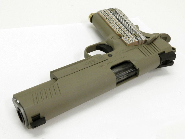 ボリュームを増したピカティニレールには金属製の別部品を採用することでヘビーな重量感を再現し、スライドとフレームに施された独特なマーキングは、彫刻機を用いてシャープに再現。G10の模様をイメージした鮮やかなグリップには、45ACP弾のリムで回せるよう工夫されたラージヘッド・グリップスクリューを使用。フレームには海兵隊の要望通り、トリガーガード下部にアンダーカット加工が施されている。そして、ヘビーウエイト樹脂製のスライド、フレームおよび各部パーツには、Cerakote社のタン・カラーコーティングをイメージした焼付塗装が施され、均一な質感をもった美しい仕上げの製品となっている。